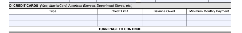 - Section D – Credit Cards/Digital Assets: Enter all credit cards, even with no balance, plus digital wallets or crypto exchanges with their current value.