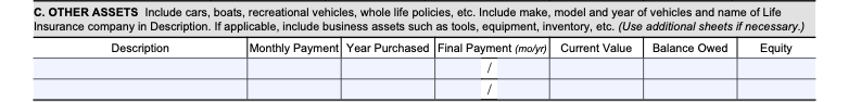 - Section C – Other Assets: List vehicles, boats, RVs, whole life insurance cash value, or collectibles. For leases, write “lease” in the year column. Include business tools and intangible assets like patents or domain names.